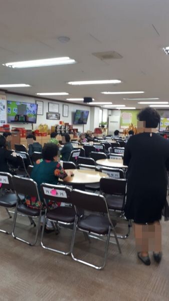 당시 20여명의 어르신이 소규모 원형테이블에 의자 한 개를 사이에 두고 띄엄띄엄 둘러앉았고 업체 직원은 건강기능식품 설명에 한창이었다.