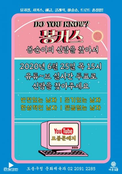 첫 공연인 ‘6월 지역예술인의 밤-봉순이의 신랑을 찾아서’는 6월 25일 오후 3시에 도봉문예지 유튜브에서 실시간 스트리밍 된다.