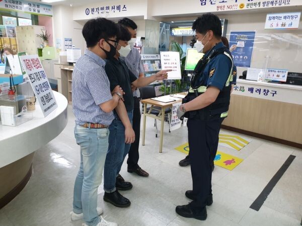 이날 훈련은 행정안전부 ‘공직자 민원응대 매뉴얼’에 따라 모의 상황 발생, 민원인 제지 및 진정, 피해 공무원 보호 및 일반 민원인 대피, 비상벨 호출, 경찰 출동, 악성 민원인 연행 등 단계별 가상 시나리오에 맞춰 진행됐다.