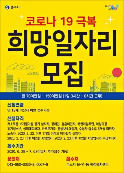 신청대상은 지역 경제 침체로 생계지원이 필요한 충주시 거주 만 18세 이상 시민이며 생계비 지원이 되는 생계급여 수급자, 실업급여 수급자 등은 참여가 제한된다.