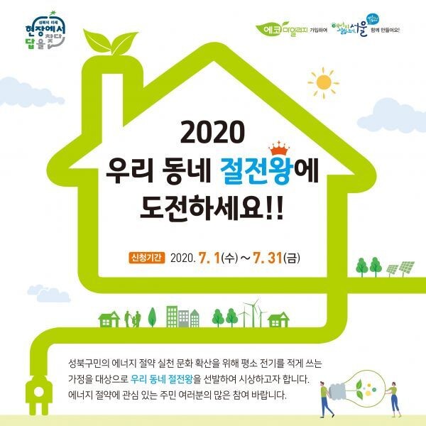 [무한뉴스] 성북구는 구민의 에너지 절약 우수사례를 발굴해 보급하고 자발적인 에너지 절약 실천 문화를 확산하기 위해 “2020 우리 동네 절전왕”을 선발한다고 밝혔다.