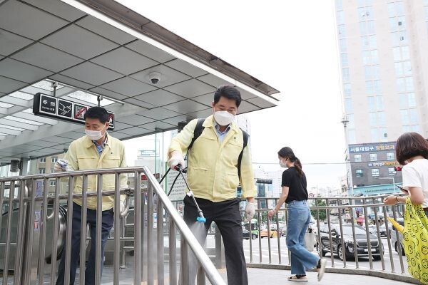 그 대신 자택에서 구청까지 출근길에 직원들과 함께 지하철역 손잡이, 자전거 거치대, 공중전화 부스, 골목길 상점 등을 꼼꼼히 방역활동을 하는 것으로 첫 일정을 시작했다.