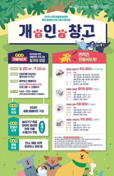 2020 청주생활문화센터 운영 활성화 프로그램 지원 사업인 ‘개인창고’ 일환으로 진행하는 이번 프로그램은 사람과 반려견의 행복한 동행을 위한 것으로 반려견을 위한 팝아트 컬러링 · 헌옷 리폼 · 수제간식 쿠킹 · 놀이기구 목공 등 총 4개의 클래스로 구성되어 있다.