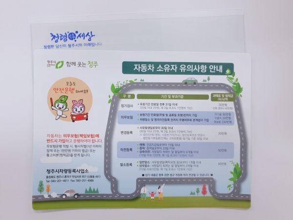 청주시 관계자는 “자동차등록증의 분실을 방지하고 자동차 관련 의무사항 홍보를 위해 자동차등록증 케이스를 제작하게 됐다”며 “앞으로도 다양한 매체를 활용해 의무사항을 홍보해 법규를 몰라 피해를 입는 시민들이 없도록 적극 안내하겠다”고 말했다.