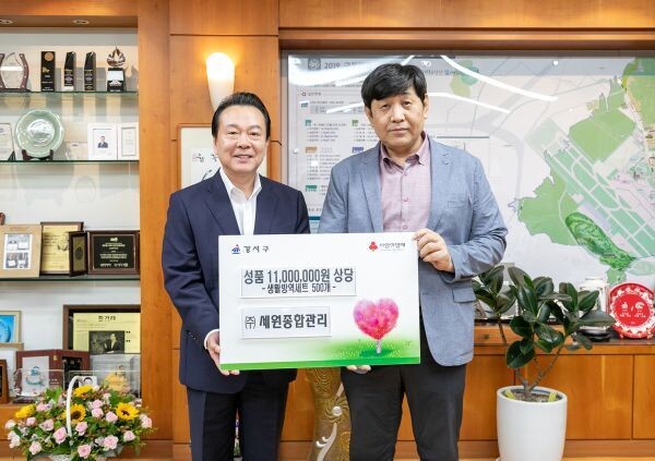 ㈜세원종합관리는 건물과 시설의 위생관리, 소독, 청소 등을 위탁 관리하는 전문 기업으로 이날 지역 내 사회복지시설과 저소득 주민을 위해 써달라며 살균소독제 500상자를 기증했다.