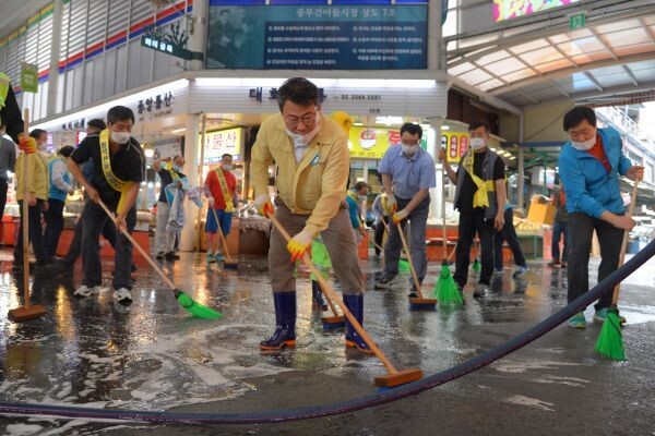 [무한뉴스] 중구가 중부시장 상인들과 함께 지난 1일 오후 시장 통로 바닥을 깨끗하게 청소하고 코로나 일상 속 전통시장 활성화를 위한 각오를 다졌다.