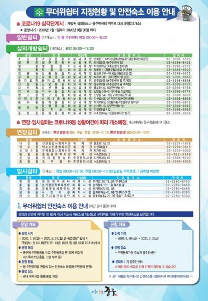 서양호 중구청장은 "코로나19 장기화에 기온도 예년보다 높을 거라는 발표도 있어 올해는 힘든 여름이 예상된다"며 "이에 폭염기간 중 열대야를 대비한 안전숙소 운영과 실외 개방형 무더위쉼터 운영으로 융통성을 발휘했다 중구민 여러분이 안전하고 쾌적한 여름을 날 수 있도록 최선을 다하겠다"고 덧붙였다.