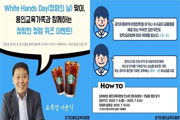 한편, 첫청렴의 날을 맞이해 용인교육지원청 인스타그램에서 7월 6일부터 7월 8일까지 3일간 교직원과 학생, 국민 모두가 참여할 수 있는 '청량한 청렴 퀴즈 이벤트'를 진행한다.