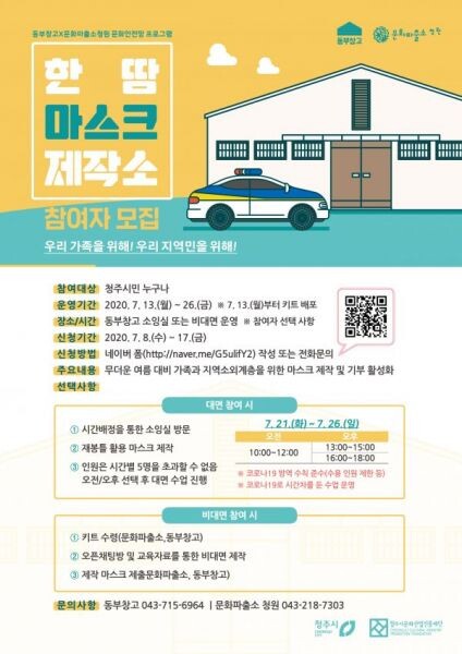 청주시문화산업진흥재단은 오는 17일까지 ‘동부창고?문화파출소 청원’합동 프로젝트 ‘한 땀 마스크 제작소’와 함께할 참가자를 모집한다고 밝혔다.