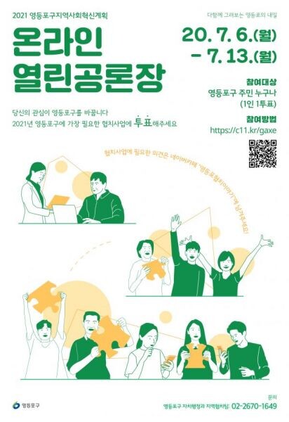 [무한뉴스] 영등포구는 구민의 의견을 수렴해 지역사회 문제를 해결하기 위한 첫걸음으로 2021년 지역사회혁신계획의 협치사업 의제를 선정하는 ‘2020 영등포 열린공론장’이 7월 6일부터 7월 13일까지 8일간 개최된다고 밝혔다.