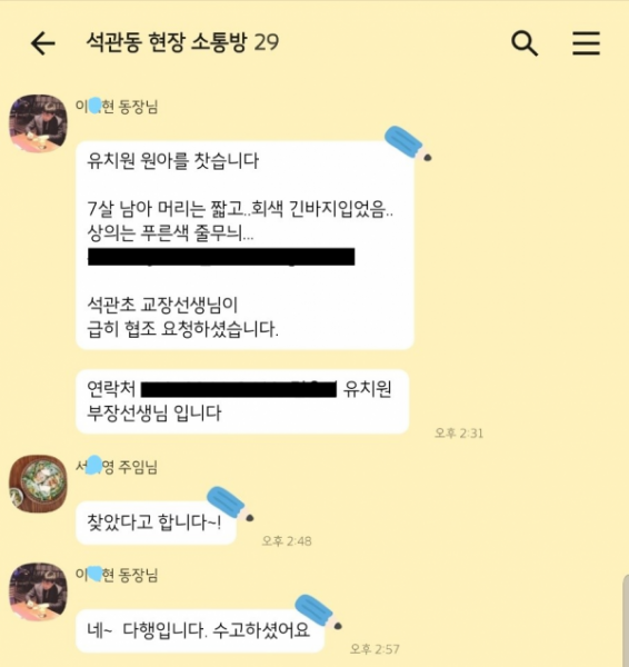 협조요청을 받은 즉시 석관동장은 ‘석관동 현장소통방’ 및 실시간 ‘주민 소통방’에 실종 아동의 인상착의, 이름, 주소 등을 전달했다.