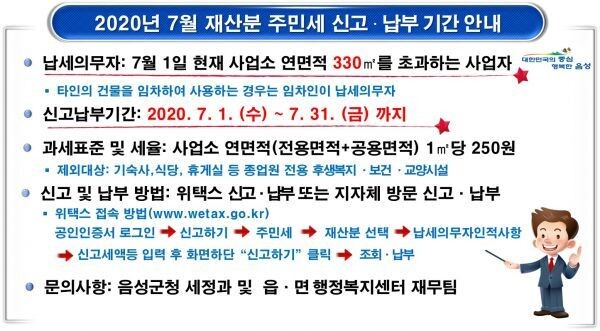 재산분 주민세 신고·납부대상은 과세 기준일인 7월1일 현재 음성군 관내에 소재하는 건축물, 기계장치, 저장시설 등의 사업장 건축물 연면적이 330㎡를 초과하는 사업주다.