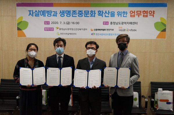 최근 충남광역정신건강복지센터는 신용회복위원회 천안지부, 천안시자살예방센터, 천안시중독관리통합지원센터와 자살예방 및 생명존중문화 확산을 위한 업무협약을 체결했다.