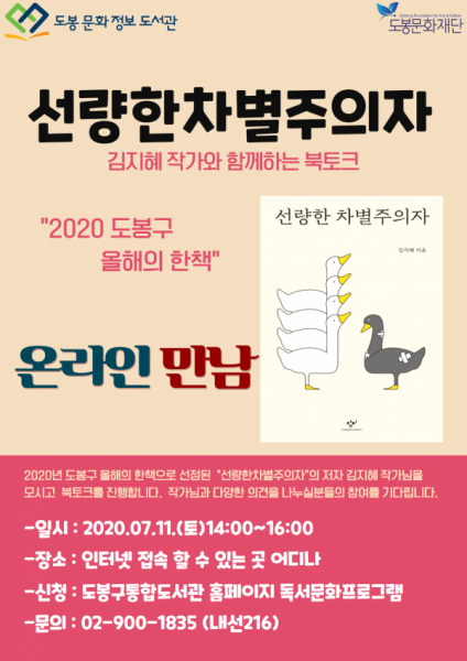 [무한뉴스] 도봉구 도봉문화정보도서관은 오는 11일 '선량한 차별주의자' 김지혜 작가와 함께하는 온라인 북토크를 진행한다.