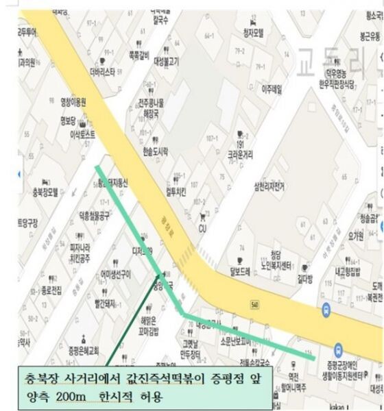 주·정차 허용도로는 증평 장뜰시장 충북장 사거리에서 값진 즉석떡복이 앞 양측 200미터 도로이다.