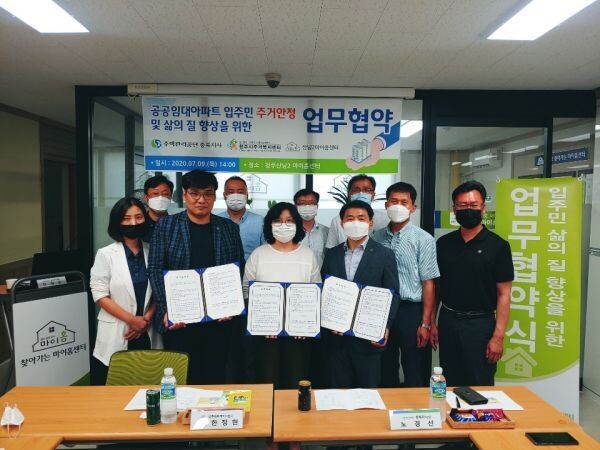 [무한뉴스] 청주시주거복지센터는 9일 오후 2시 청주산남2 마이홈센터에서 주택관리공단 충북지사, 산남2 마이홈센터와 주거복지 상호 협력체제 구축을 위한 업무협약을 체결했다.