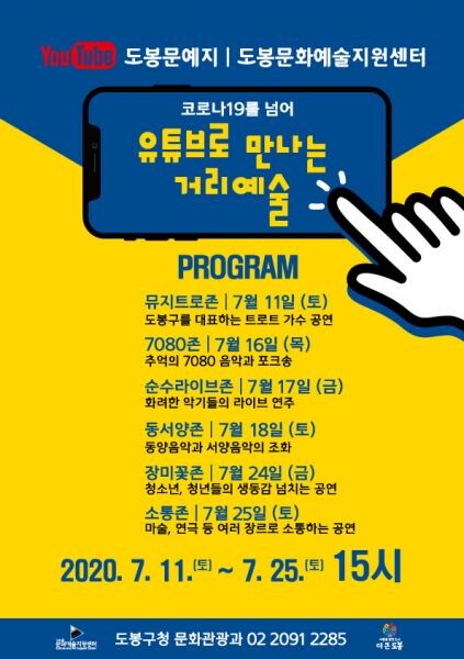 야외공연에 어려움을 겪고 있는 도봉구 거리예술단을 위해 마련된 이번 ‘유튜브로 만나는 거리예술’ 온라인공연에서는 가요, 밴드, 트로트, 악기연주, 뮤지컬 등 다양한 장르의 무대가 풍성하게 펼쳐질 예정이다.