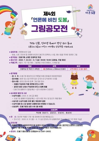 이동진 도봉구청장은 “그림 공모전을 통해 아이들이 내 마을에 대해 더 관심을 갖는 기회가 되길 바라며 아이들만의 시선으로 바라본 다양하고 반짝이는 도봉구를 담은 작품이 많이 나오길 기대한다”고 말했다.