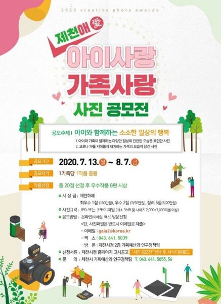 [무한뉴스] 아이가 주는 기쁨과 가족의 소중함을 서로 공유해 가족 친화적인 사회분위기의 조성 및 결혼 출산에 긍정적인 가치관을 형성하고자 제천시에서 처음으로 ‘제천애 아이사랑 가족사랑 사진 공모전’을 개최한다.