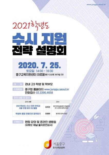 [무한뉴스] 중구가 오는 25일 오후 2시 곧 문을 열게 될 '중구 교육지원센터 이로움'에서 '2021학년도 수시 지원 전략 설명회'를 개최한다.
