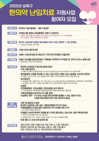 이 사업은 2017년에 구와 협약을 체결한 성북구 한의사회의 협력을 통해 진행되며 신청일 기준으로 서울시에 6개월 이상 거주한 성북구민 중 자연임신을 원하는 원인불명의 난임부부면 누구나 신청할 수 있다.