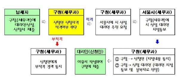 신청방법은 납세자가 구청 세무과에 이의신청서 대리인 선정 신청서 등을 제출하면 납세자의 소득과 재산요건 등을 검토한 후 접수일로부터 7일 이내에 대리인을 지정해 주는 방식으로 운영된다.