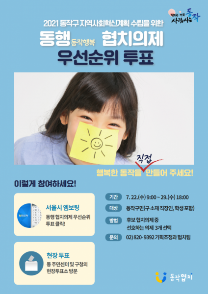 결과는 다음달 10일 구청 홈페이지 및 동작협치 SNS 내 투표결과 공유페이지에 공개예정이다.