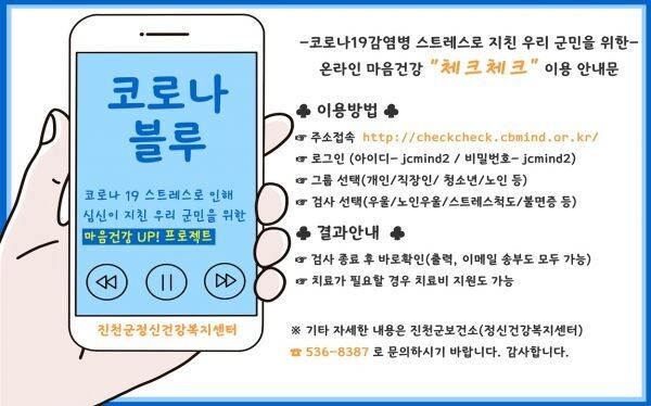 [무한뉴스]진천군이 코로나19로 지친 진천군민의 정신건강을 보호하기 위해 온라인 마음건강 UP 프로젝트 ‘체크체크’를 운영한다.
