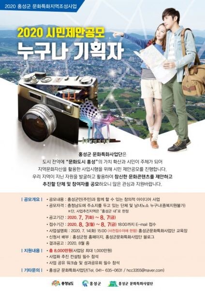 주민이 필요로 하는 문화콘텐츠 사업을 주민 스스로 기획하는 이번 시민제안공모 사업은 홍성군민이 함께 참여할 수 있는 다양하고 참신한 제안사업을 모집한다.