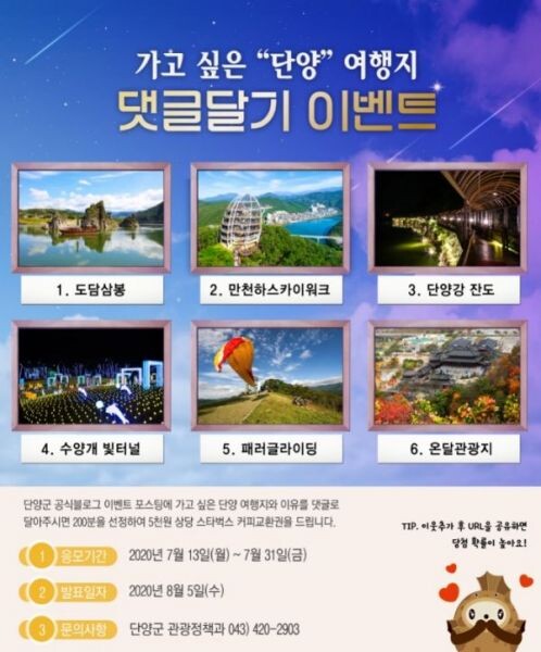 응모 방법은 단양군 문화관광 공식 블로그를 통해 단양 주요 관광지 중 여행가고 싶은 곳과 그 이유를 댓글로 이달 31일까지 남기면 된다.