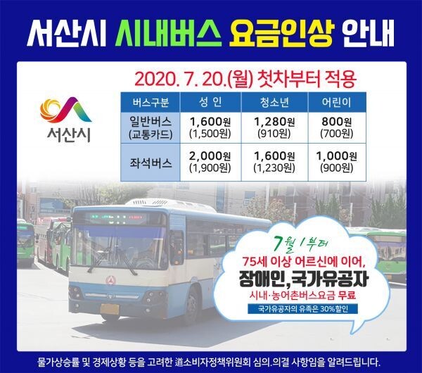 [무한뉴스]서산시에 따르면 지난 6월 29일 충청남도 소비자정책위원회 의결과 충청남도 시내버스 요금조정 및 적용기준 통보에 따라 시내버스업체로부터 요금 변경신고를 수리하고 이달 20일부터 시내버스 요금을 200원 인상하기로 했다.
