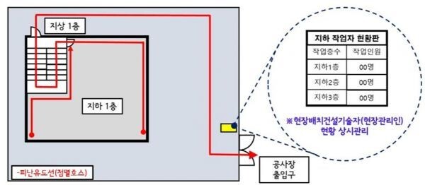 구는 안전대책이 건축공사장에 신속하게 적용될 수 있도록 ‘지하층 작업인원 현황판’과 ‘간이피난유도선’ 설치를 건축허가 조건으로 부여하고 건축주가 착공 전 설치예정확인서를 제출토록 할 예정이다.