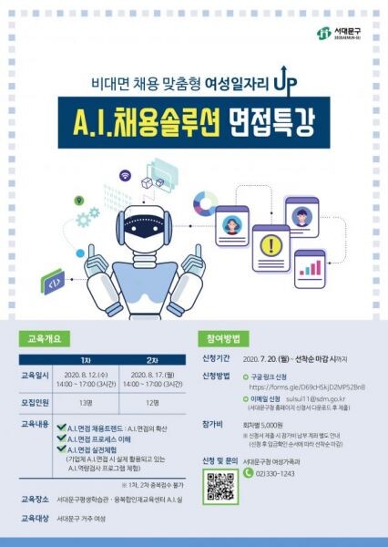 [무한뉴스] 서대문구는 코로나19에 따른 비대면 채용 확산 추세 속에서 관내 여성 구직자들의 취업역량 강화를 위해 ‘인공지능 채용솔루션 면접특강’을 개최한다고 17일 밝혔다.