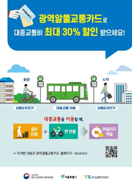 ‘광역알뜰교통카드’란 대중교통 이용을 위해 걷거나 자전거로 이동한 거리를 마일리지로 적립하고 카드사 할인혜택 10%를 연계해 최대 대중 교통비를 30%까지 절감할 수 있는 교통카드를 말한다.
