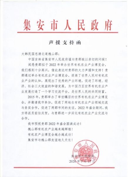 괴산군에 따르면 집안시 인민정부는 17일 괴산군에 서신을 보내 유기농산업의 확산과 발전을 위해서는 2022 괴산세계유기농산억엑스포의 개최가 반드시 필요하다고 밝혔다.