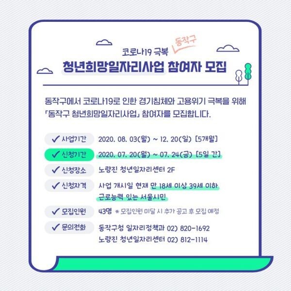 [무한뉴스] 동작구가 오는 24일까지 ‘코로나19 극복 청년희망일자리사업‘ 참여자 43명을 모집한다고 밝혔다.