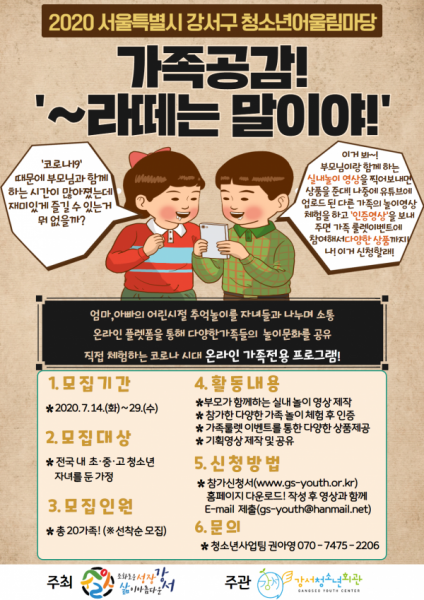 한편 구는 지난 4월 청소년 어울림마당 ‘방구석 가요제’를 성황리에 마무리하고 하반기에는 청소년뿐만 아니라 가족들까지 온라인 플랫폼에서 즐길 수 있도록 다양한 비대면 프로그램을 마련할 계획이라고 전했다.