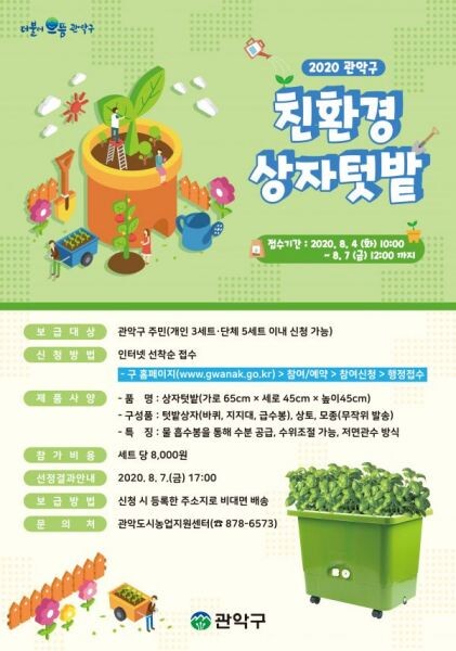 선정결과는 8월 7일 오후 5시 이후 관악구청 홈페이지 공지 및 문자로 개별 안내할 예정이며 신청한 상자텃밭세트는 신청인의 주소지 또는 소재지로 직접 배송, 비대면으로 전달할 계획이라고 전했다.