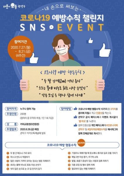 “코로나19 예방수칙 챌린지” S.N.S 이벤트와 관련한 자세한 내용은 관악구 공식 S.N.S 채널에서 확인할 수 있다.