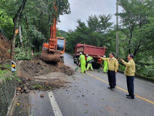 김 군수는 23일과 24일 120mm 넘게 내린 비로 무너짐 피해를 입은 장평면 지천리 군도와 분향리 리도 현장을 방문, 주민불편 최소화와 안전사고 예방을 위한 복구활동을 살폈다.