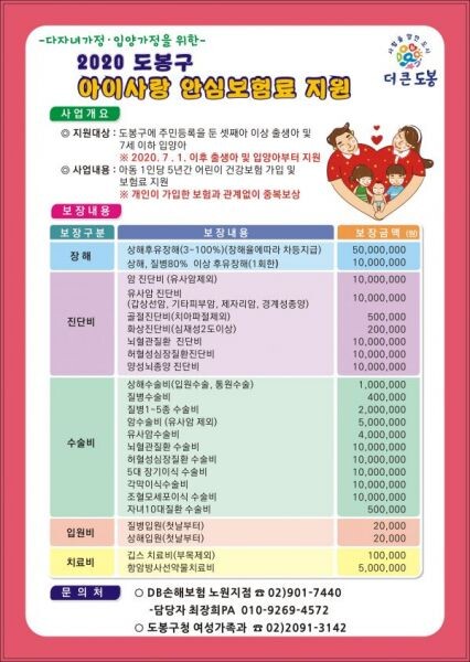 [무한뉴스] 도봉구는 올해 7월 1일 이후 출생하는 셋째아 이상 다자녀가정 및 입양가정의 양육부담을 완화하기 위해 ‘도봉형 아이사랑 안심보험료 지원’ 사업을 실시한다.
