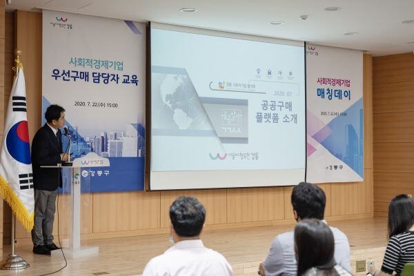 [무한뉴스] 강동구가 신종 코로나바이러스 감염증로 위축된 사회적경제를 활성화하고 사회적경제기업의 판로 개척을 지원하기 위해 지난 22일 구청 5층 대강당에서 ‘사회적경제기업 우선구매 담당자 교육 및 매칭데이’를 열었다.