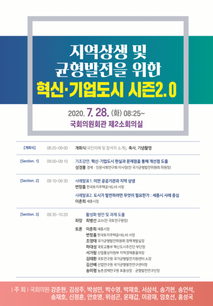 가칭‘혁신·기업도시 발전을 위한 여야 의원모임’은 28일 오전8시30분 국회의원 제2소회의실에서 ‘지역상생 및 균형발전을 위한 혁신·기업도시 시즌2’를 주제로 대토론회를 개최한다.