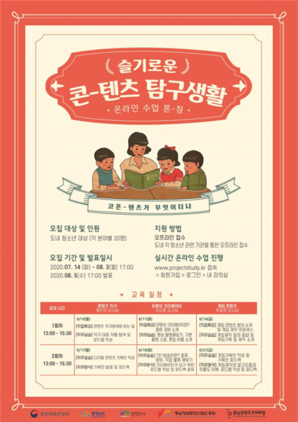 전체 프로그램은 충남콘텐츠코리아랩 온라인 학습관리시스템으로 진행되며 충남 거주 청소년이면 누구나 참여할 수 있다.