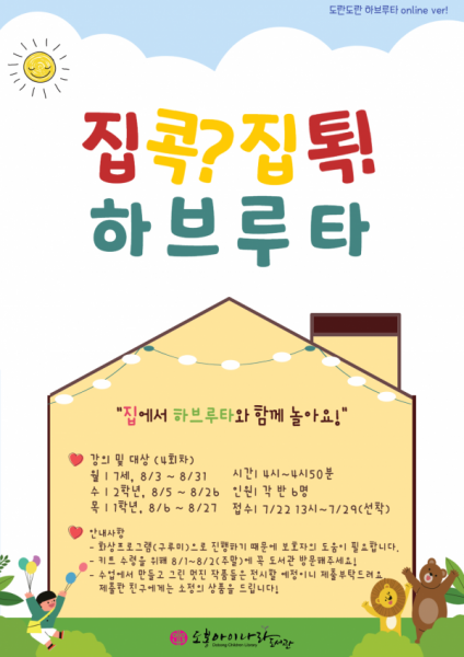 [무한뉴스] 도봉구 도봉아이나라도서관은 독서토론의 일상화와 코로나19로 인해 결핍된 문화생활을 향유 할 수 있도록 8월부터 ‘비대면 독서토론 하브루타 프로그램’을 운영한다.