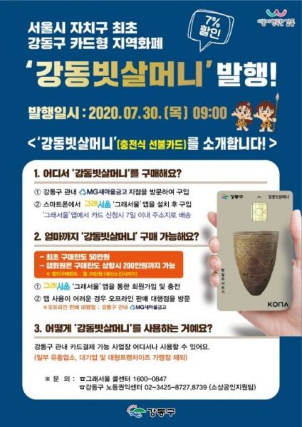 [무한뉴스] 강동구가 지역 내 소비 촉진과 소상공인 매출 증대를 위해 7월 30일 오전 9시부터 서울시 자치구 최초로 카드형 지역화폐인 ‘강동빗살머니’를 발행해 판매를 시작한다.