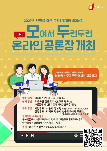 [무한뉴스] 중구가 29일 오후4시 중구 공식 유튜브 채널 '을지로전파사'에서 2021년 시민참여예산 구단위계획형 의제를 선정하기 위한 온라인 생방송 '모여서 두런두런 공론장'을 개최한다.