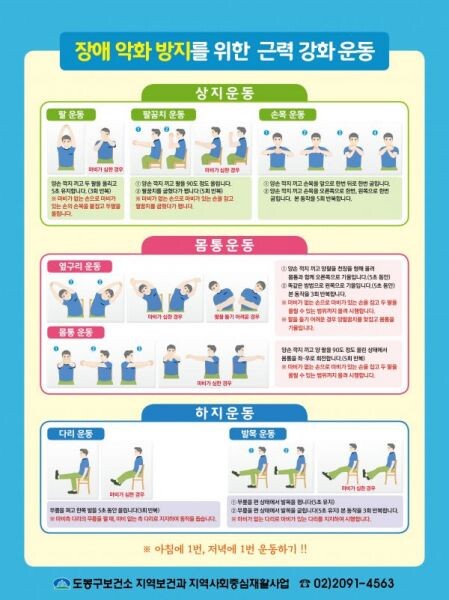 이동진 도봉구청장은 “사회적 거리두기로 가정에만 계시는 장애인과 허약노인에게 장애악화방지 근력강화운동 포스터가 재활촉진 및 건강증진에 도움이 되길 바라며 코로나19 상황 종료 시까지 전화안부 및 모니터링 등 비대면 관리체계를 유지해 건강지원 공백을 최소화 하겠다”고 말했다.