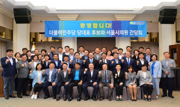 이날 간담회에는 서울시의회 김인호 의장, 김기덕 부의장, 김광수 부의장, 조상호 대표의원, 김정태 운영위원장을 비롯해 약 60여명의 의원이 참석했으며 김종민 최고위원 후보자도 함께 자리했다.