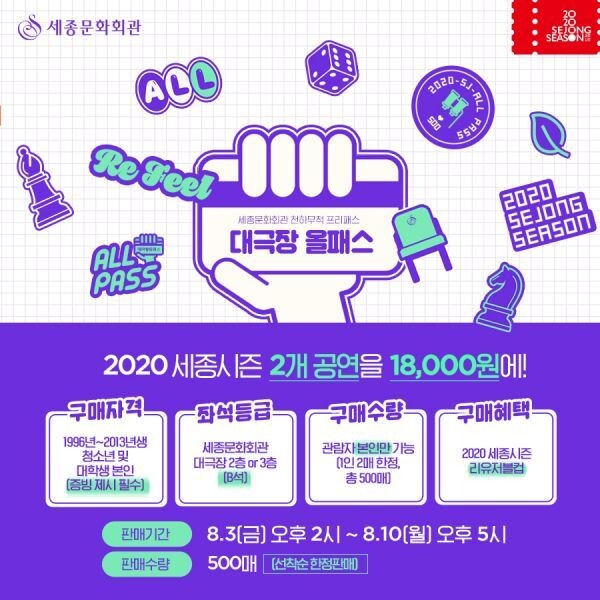 ‘2020 대극장 올패스’는 8세 이상 25세 이하의 초, 중, 고 대학생만 구매할 수 있으며 관람 자격이 되는 본인만 세종문화회관 홈페이지 가입 후 구매 할 수 있다.